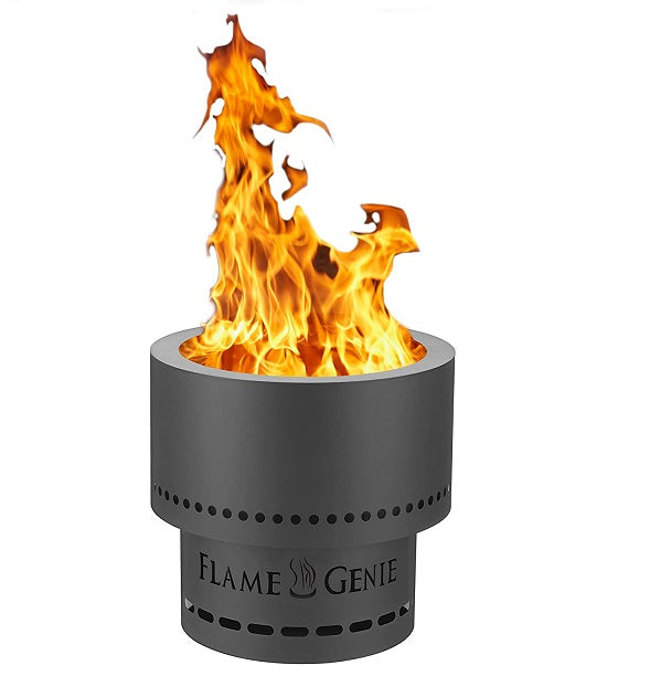 Flame Genie Stainless Steel Wood Pellet Fire Pit! The unique gravitational afterburner system generates longer burn times without the smoke, sparks and cleanup associated with traditional wood fire pits. Flame Genie burns easy-to-handle wood pellets that produce minimal ash, making cleanup a breeze! Use it on your patio, or pack it up and take it to your campsite. The compact design is portable and easily stores in an RV locker or car truck. The black galvanized steel fire pit is ideal for smaller patios, tailgates and campsites.